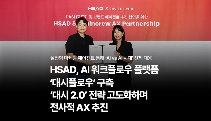 이를 위해 HSAD는 지난 16일, AI 솔루션 전문 기업 ‘브레인크루’와 전략적 업무협약(MOU)을 체결하고 공동 개발에 착수했습니다. 이번 협약에는 ▲AX 전략 수립 ▲광고 마케팅 특화 AX 솔루션 공동 개발 ▲AX 솔루션 기반 신사업 협력 등이 포함됐습니다.