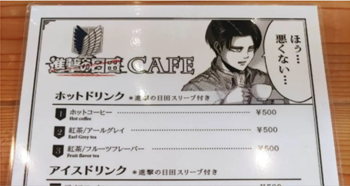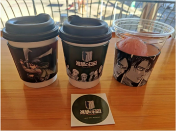버스 투어 중이지만, 지킬 건 지켜야 합니다. 식사 후 커피는 국룰이죠? 카페도 히타 시가 운영하는 콘셉트 카페로 갑니다! 문화회관 같은 건물 2층에 애매하게 자리 잡은 외관을 보고 하면 처음에는 실망하실 수도 있고, 외로워 보이는 직원 한 명으로 운영되는 내부를 보고 나면 불안하실 수도 있습니다. 하지만, 생각보다 커피가 맛있습니다! 장엄한 <진격의 거인> OST가 흐르는 카페의 창 밖으로는, 공원 놀이터에서 평화롭게 놀고 있는 아이들이 보입니다. 게다가 <진격의 거인> 캐릭터가 들어있는 음료 슬리브도 공짜로 받을 수 있습니다. 이 정도면, 음… 나쁘지 않습니다!