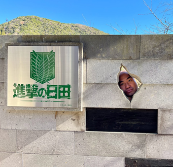 자, 다들 신나게 즐기셨나요? 히타역 남쪽 광장에는 최강의 인간 리바이 병장의 동상이 있습니다. 리바이 병장뿐만 아니라, 역 안과 밖의 다양한 포토스팟에서 기념사진 촬영을 갖겠습니다. 이쯤에서 다시 [진격의 히타] 앱 AR 기능을 실행해 봅시다. 히타역 위에서 날 내리찍는 짐승거인과 함께 재미있는 기념사진을 찍을 수 있습니다!