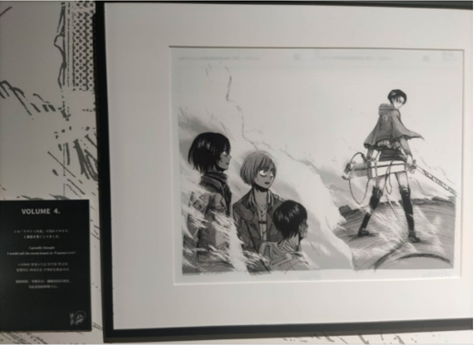삿포로 맥주 공장 옆에 위치한 별관은 <진격의 거인> 명장면에 대한 작가의 소감 위주로 구성되어 있습니다. 작가는 4권을 ‘리바이 병장이라는 캐릭터로 인기를 얻고야 말겠다!’는 생각으로 그렸다고 합니다(아래 좌측 사진). 그 의도는 정확히 성공하여, 리바이 병장은 <진격의 거인> 최고의 인기 캐릭터가 됩니다. 수많은 초대형 거인이 전지구를 짓밟아버리는 땅울림 장면(아래 우측 사진)에 대한 코멘트도 있습니다.