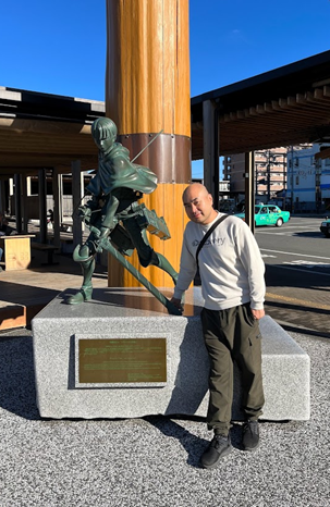 7. 기념사진 촬영: 히타역 남쪽 광장 리바이 병장 동상