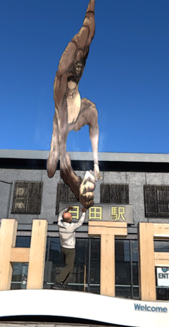 자, 다들 신나게 즐기셨나요? 히타역 남쪽 광장에는 최강의 인간 리바이 병장의 동상이 있습니다. 리바이 병장뿐만 아니라, 역 안과 밖의 다양한 포토스팟에서 기념사진 촬영을 갖겠습니다. 이쯤에서 다시 [진격의 히타] 앱 AR 기능을 실행해 봅시다. 히타역 위에서 날 내리찍는 짐승거인과 함께 재미있는 기념사진을 찍을 수 있습니다!