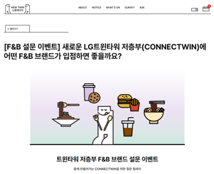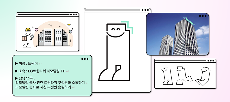 LG트윈타워는 37년 만에 저층부 공용공간 리모델링을 거쳐 지난 2024년 4월, ‘Connectwin(이하 커넥트윈)’을 오픈했습니다. 본 캠페인의 뿌리는 리모델링이 본격적으로 시작되기도 전인 2022년 하반기로 거슬러 올라갑니다. LG트윈타워의 형상을 본떠 만든 캐릭터 ‘트윈이’를 중심으로, 공사 기간 동안 다양한 온오프라인 액티베이션을 진행하며 구성원들과 소통했습니다. 새로운 공간에 입점할 F&B 브랜드, 자전거 거치대 디자인 같은 실질적인 부분부터 커넥트윈이라는 이름의 탄생까지, 커넥트윈은 구성원들의 의견을 중심으로 만든 공간입니다.
