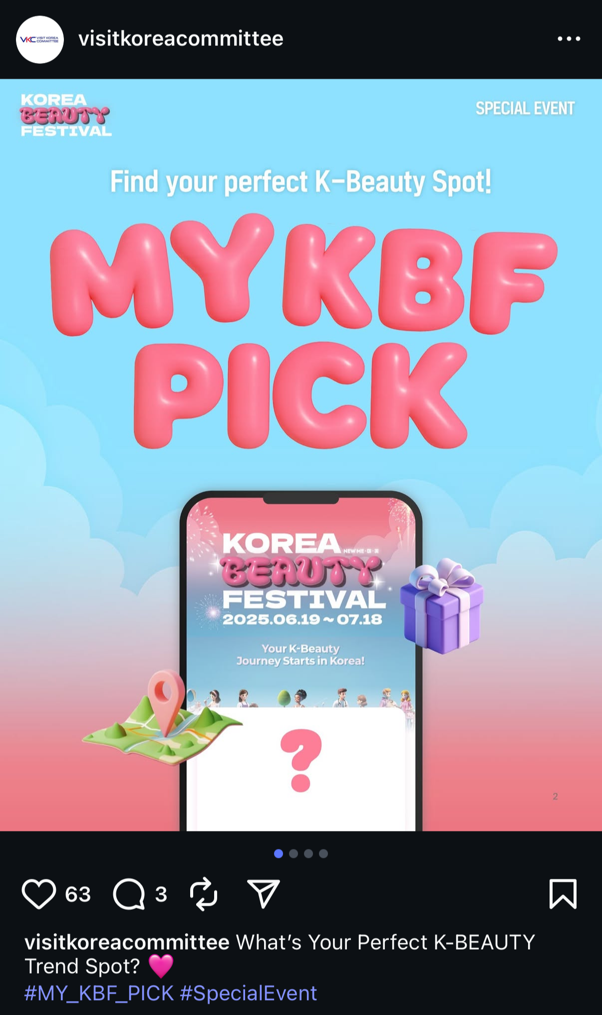 다양한 행사 공간을 순차적으로 경험하며 확장할 수 있는 ‘K-뷰티 타운’이라는 테마 아래 다양한 장소를 묶고 연결하고 확장하는 방식으로 체험할 수 있게 하였으며, 이미 한국에 방문해 있는 관광객과 6~7월에 방한 예정인 외국인들이 많이 가는 커뮤니티와 온라인 사이트 대상으로 사전 광고 집행 및 SNS 이벤트를 진행하였고, 방한객들이 국내 도착부터 출국 때까지 자주 가는 주요 장소를 따라서 사전 홍보 활동과 체험 이벤트를 진행하여 페스티벌을 입체적으로 알렸습니다.