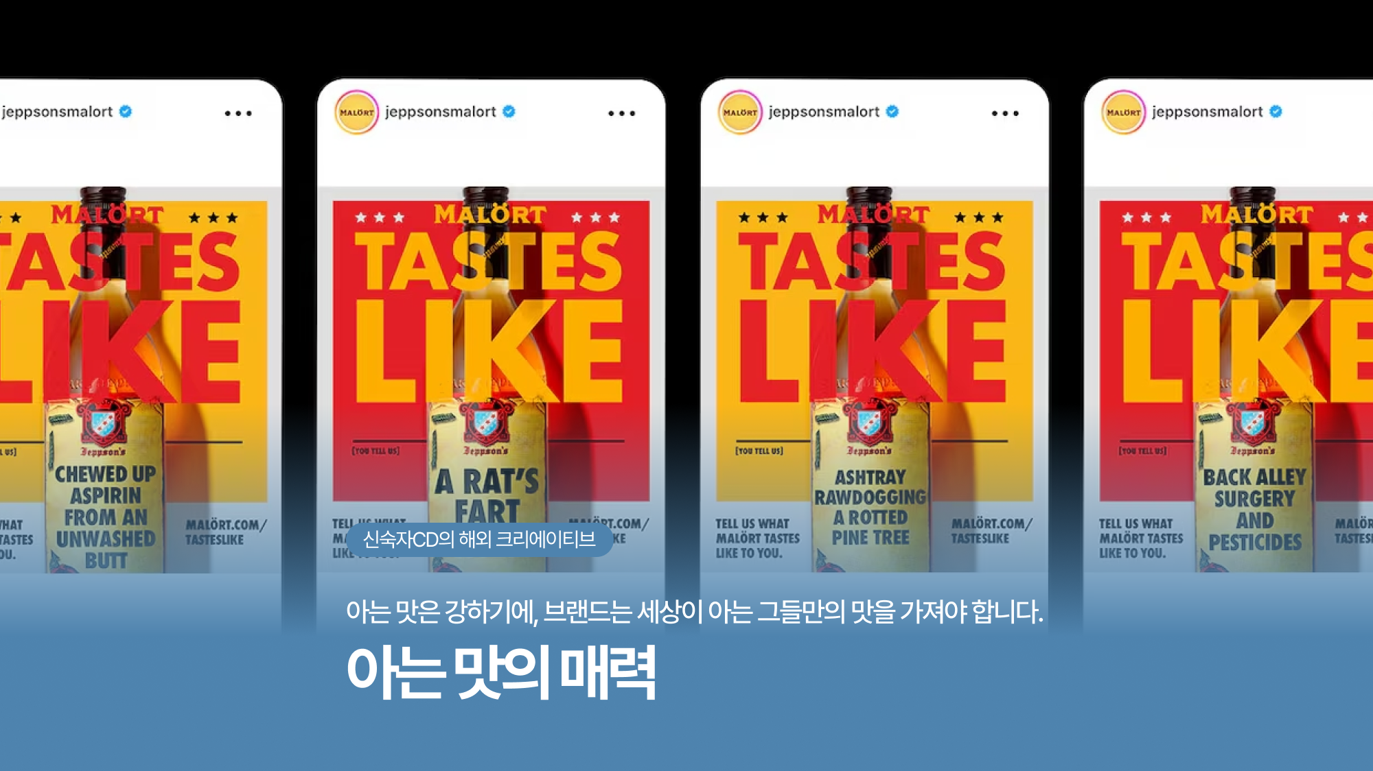 극단적인 쓴 맛으로 사람들이 혐오하는 술, Jeppson's Malort. 누군가는 이 술이 ‘고통의 통과의례’라고 표현하고 누군가는 도전의 대상이라고 합니다. 하지만 Jeppson's Molort은 오히려 맛으로 정면승부하기로 하죠. 세상의 혐오스러운 맛평가를 전면에 내세우기로 한 겁니다. 있는 그대로 신랄하게 평가하면 그중에서 최고의 표현 3가지를 선택해 실제 병 라벨로 제작할 예정입니다. 일명, “Malort Tastes Like" 캠페인. 하지만 참여한 소비자들의 평가는 결코 녹록지 않습니다.