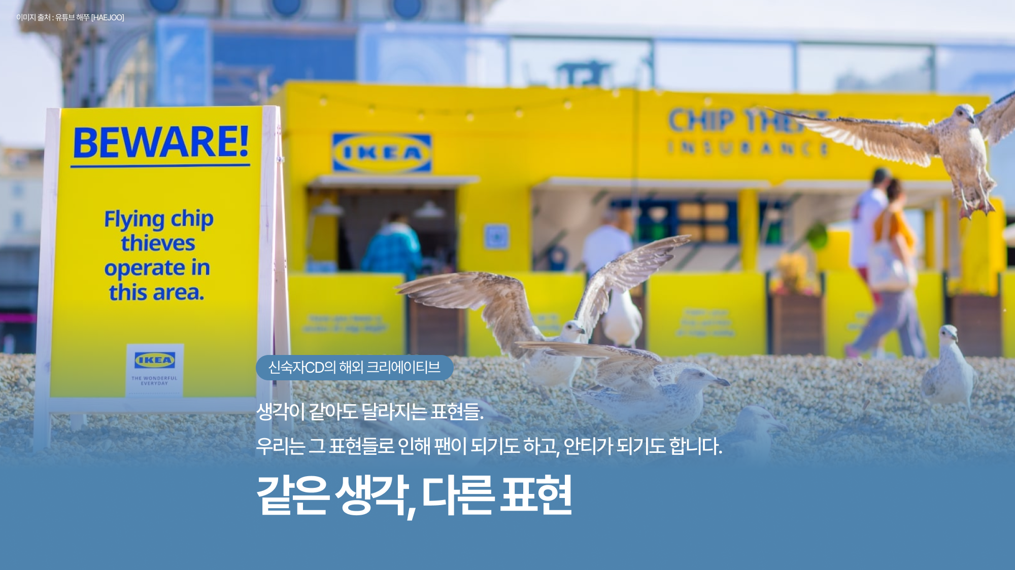 Ikea는 영국 해변 도시 브라이튼에 매장을 오픈하면서, 브라이튼 주민들과 동질감을 느끼고자 했습니다. 브라이튼의 상징적이면서 악명 높은 갈매기를 소재로 삼았으니까요. 하지만 이케아 광고 어디에도 갈매기는 나오지 않습니다. 그저 이케아 테이블과 의자에 선명하게, 갈매기가 떨어뜨리고 간 배설물만 보일 뿐입니다. 브라이튼에 사는 사람이라면 경험했을 법한 자국입니다. 이보다 ‘이케아가 브라이튼에 왔음’을 보여주는 강렬한 메시지는 없을 듯합니다.