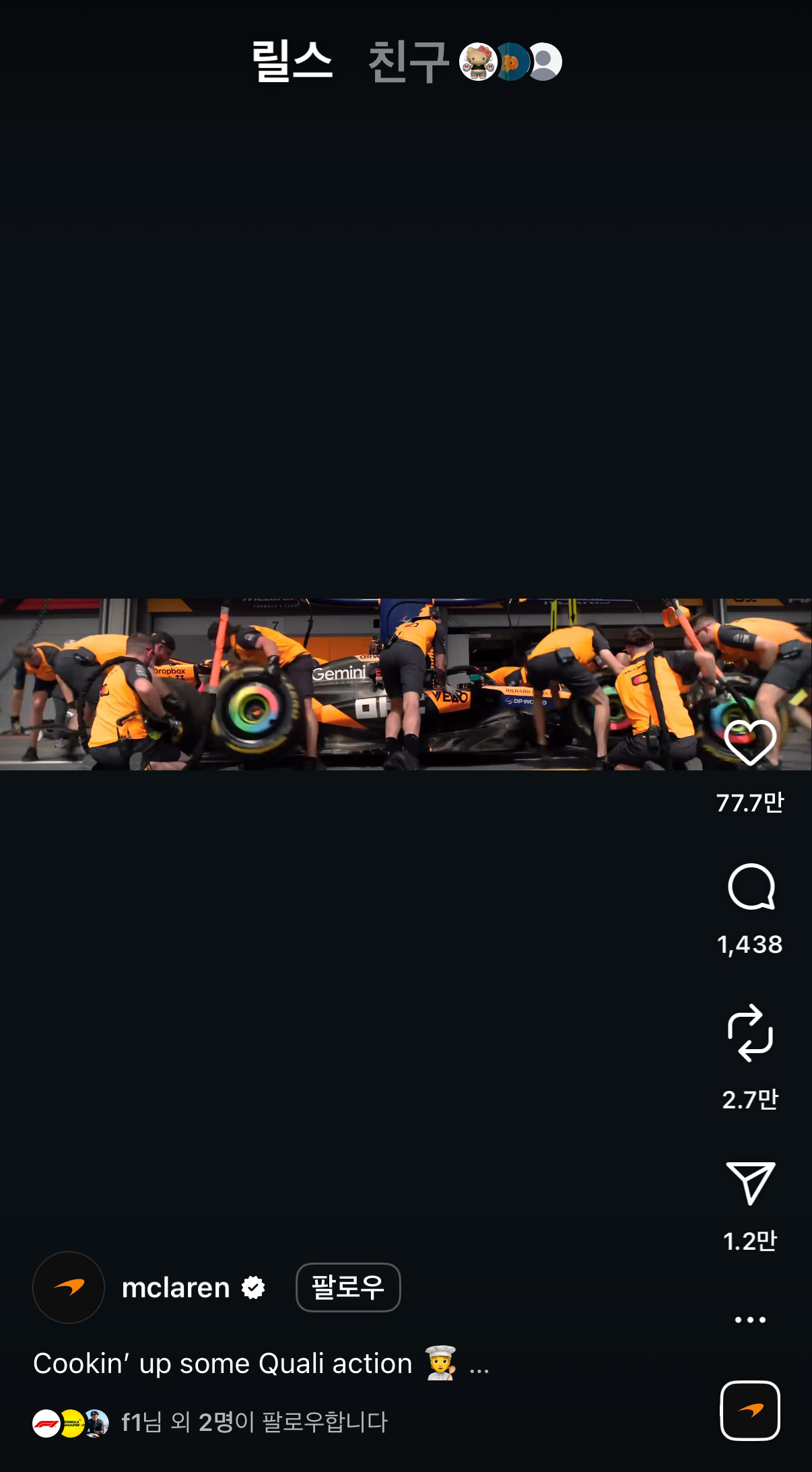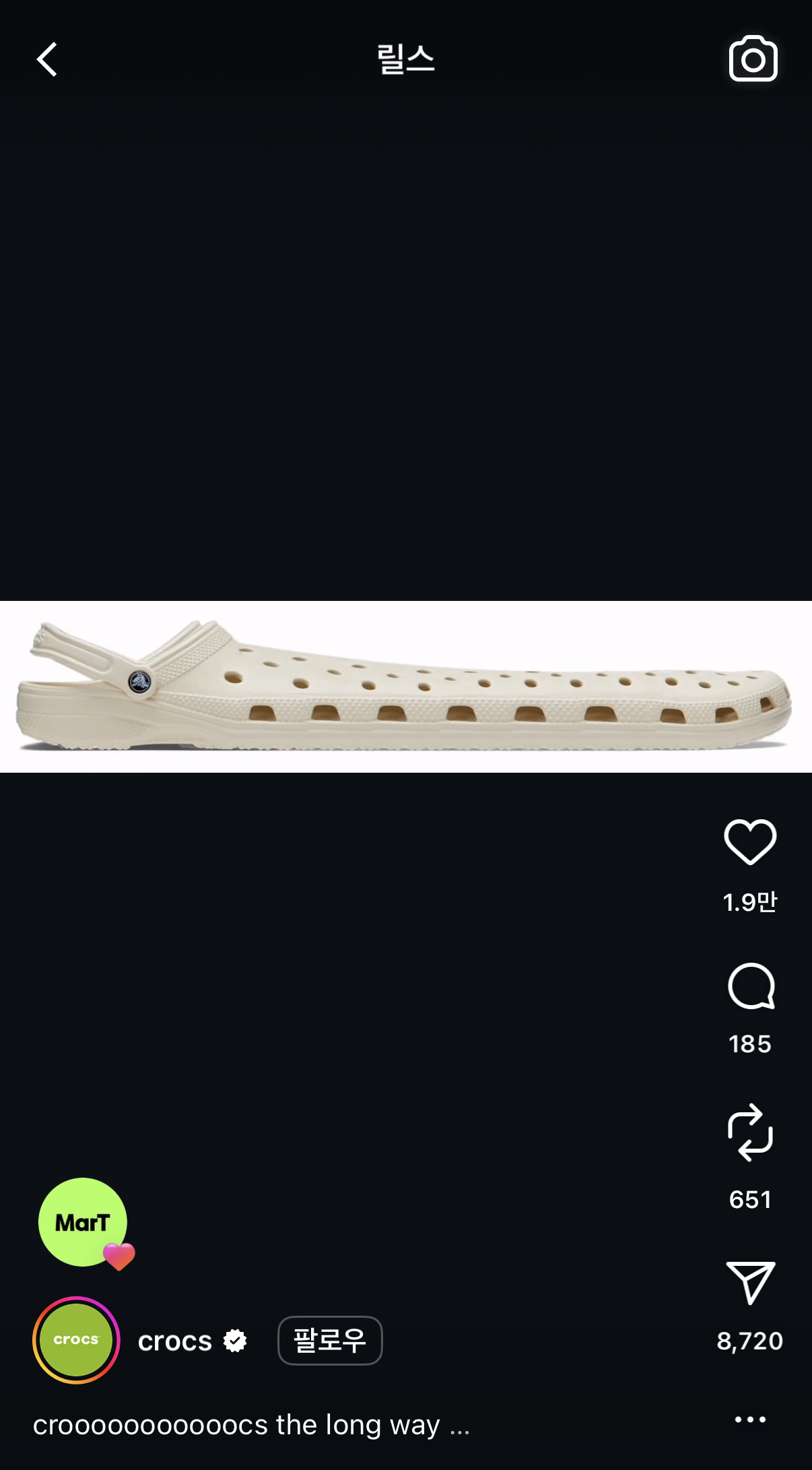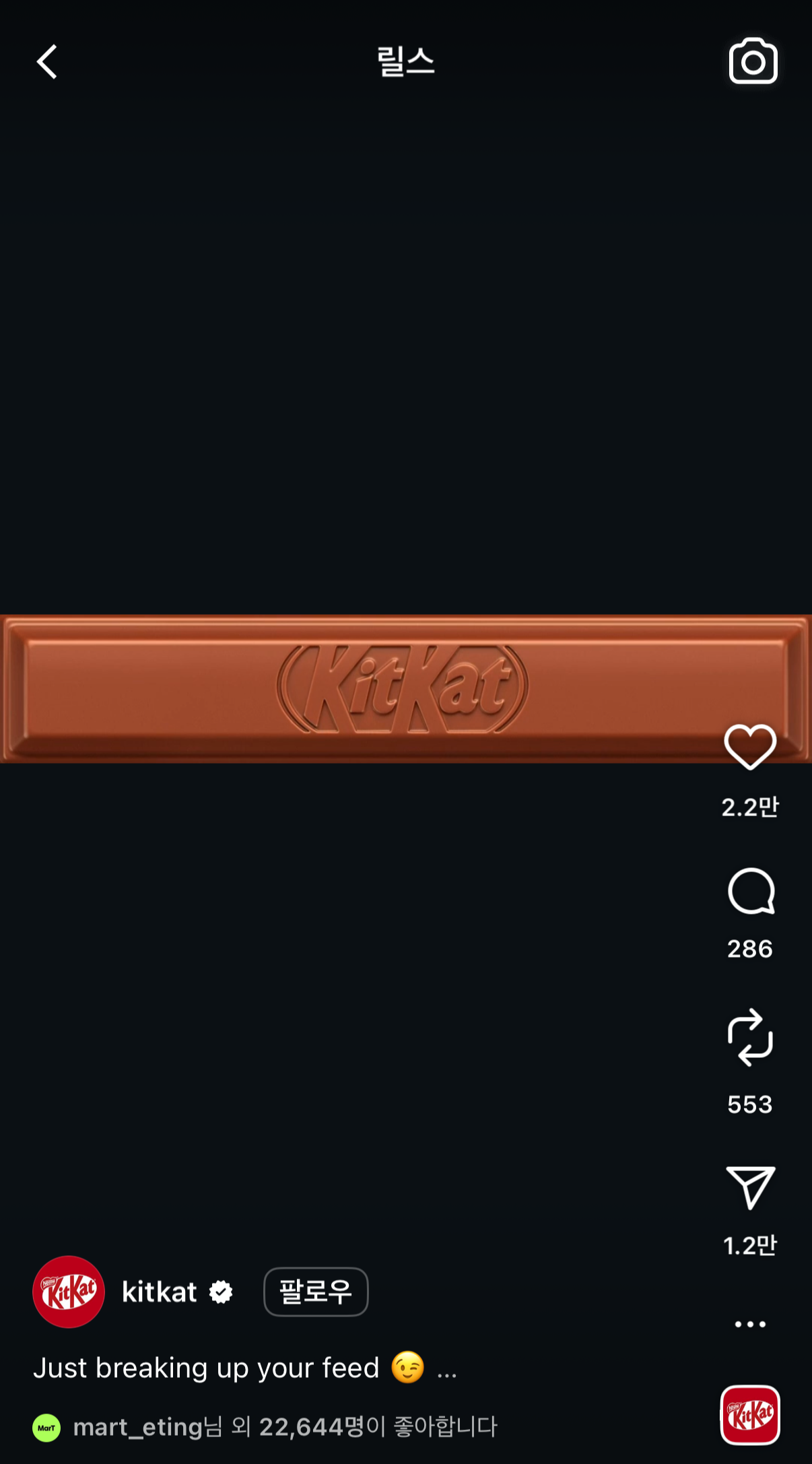 브랜드는 자신들만의 마케팅 포인트를 잡아 5120 X 1080 사이즈의 릴스 영상을 만들고 있는데요. 초콜릿 브랜드 킷캣(KITKAT)은 자신들의 길쭉한 초콜릿을 활용해 해당 릴스를 제작하고, 신발 브랜드 크록스(CROCS)는 'croooooooooocs the long way'라는 말과 함께 크록스를 사이즈에 맞게 길게 늘여 포스팅하며 재치 있는 모습을 보였어요. 외에도 F1팀 맥라렌(McLaren)은 긴 화면을 통해 레이싱 중 피트 스탑하는 장면이나 선수들이 레이싱을 준비하는 모습 등을 공개했어요.