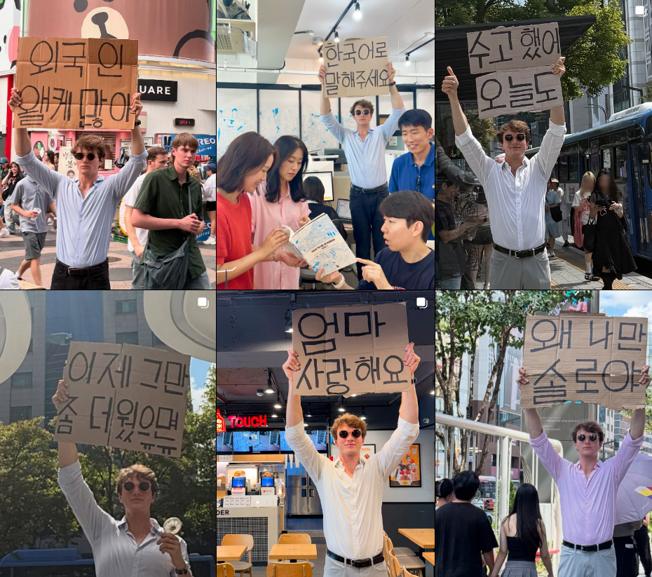 최근, 한국어로 쓰인 박스 피켓이 인스타그램에 보이기 시작했어요! dudewithsign과는 다른 사람으로 한국에 거주하는 아담 노박이에요. dudewithsign과 같이 사람들이 많은 곳에서 박스에 자신의 의견을 적어 공개하는데요!