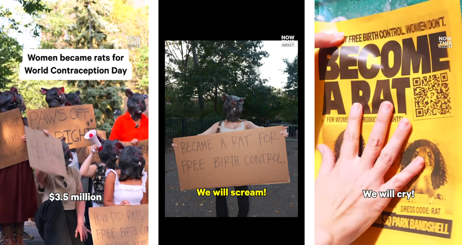 세계 피임의 날인 9월 26일 오후 4시. 톰킨스 광장에 나타난 사람들. 그들은 왜 쥐가 되어 시위를 하는 걸까요? 답은 피임약에 있습니다. 뉴욕의 쥐들은 무료로 피임약을 받는다고 합니다. 정작 세금을 내는 여성들은 혜택을 받지 못하지만. 발단은 뉴욕시가 1년 전 도입한 ‘플라코 법(Flaco's law)'입니다. 뉴욕은 쥐를 없애기 위해 쥐약을 놓기보다 쥐의 먹이에 피임약을 섞기로 결정했죠. 그러면 개체수는 자연스럽게 줄어들면서, 쥐약으로 인한 피해도 막을 수 있으니까요. 무려 350만 달러가 들어간 법입니다. 하지만 연방 의회는 사람들을 위한 ‘피임권 보장법’은 저지했습니다. 이로써 수백만 명의 여성들이 피임 사각지대에 놓이게 된 거죠. 실제로 1,900만 명이 넘는 여성들이 재정적인 상황과 지리적인 장벽 때문에 피임약을 구하지 못한다고 합니다. 그들은 ‘도시의 네 발 달린 쓰레기 더미 거주자들이 누리고 있는 권리를 여성에게도 보장하라’고 목소리를 높입니다. 관련 법안을 만들라는 의미의 “Ratify Birth Control"을 외칩니다. 쥐를 연상시키는 단어를 활용한 위트입니다.