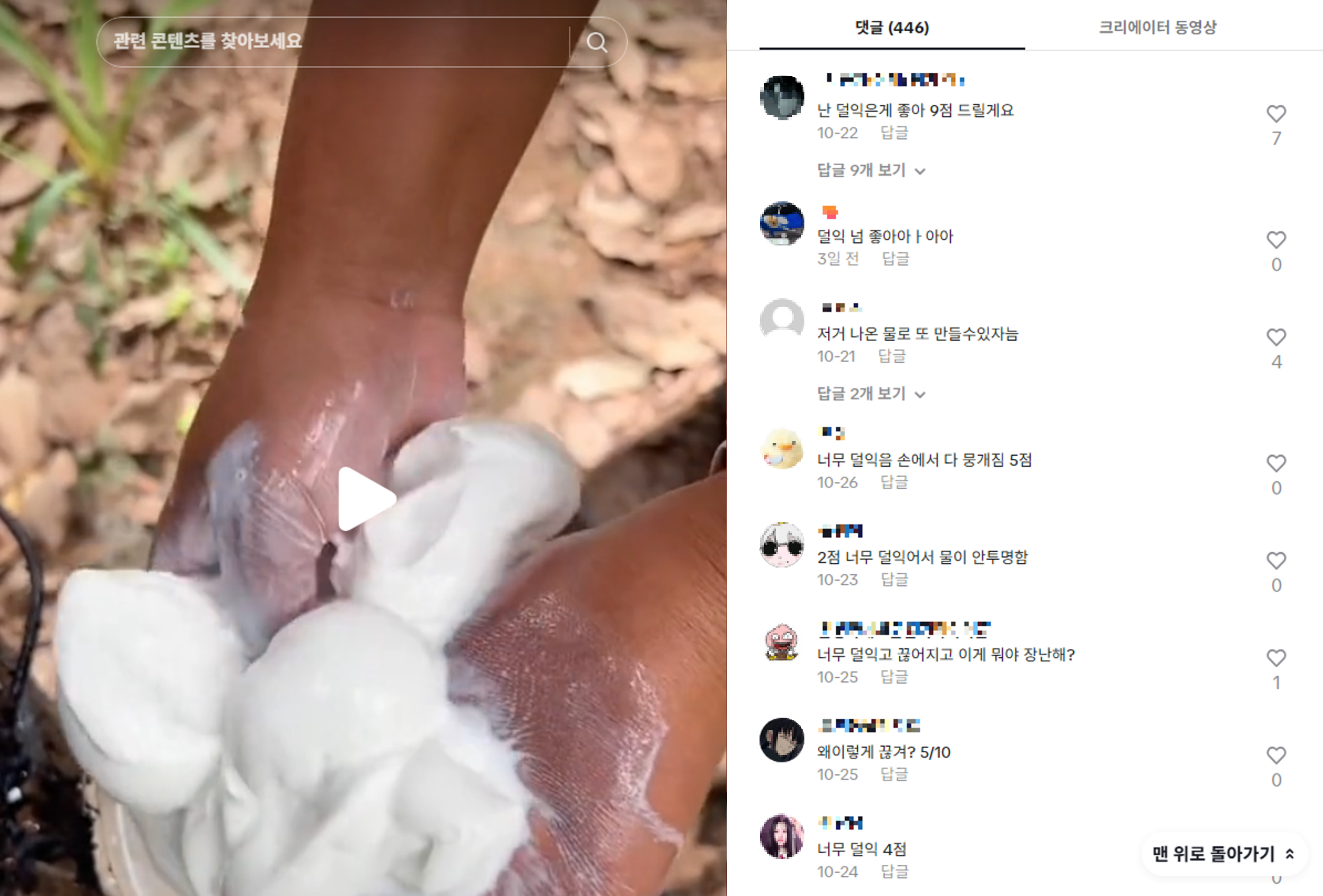 적당히 익어 마치 슬라임이나 말랑이와 같은 촉감을 보여주는 고무나무 채취 영상에는 긍정적인 댓글이 가득하답니다. 물론, 개인에 따라 덜 익은 걸 선호하는 사람과 많이 익은 걸 선호하는 사람도 있어요!