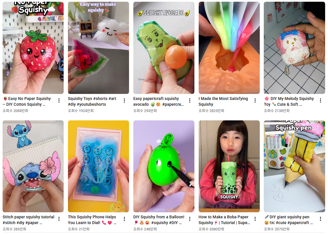 스퀴시 같은 경우는 종이 스퀴시에서 더 발전하여, 왁스로 일반 스퀴시를 코팅하여 왁스를 부수는 ASMR 콘텐츠가 늘고 있어요.