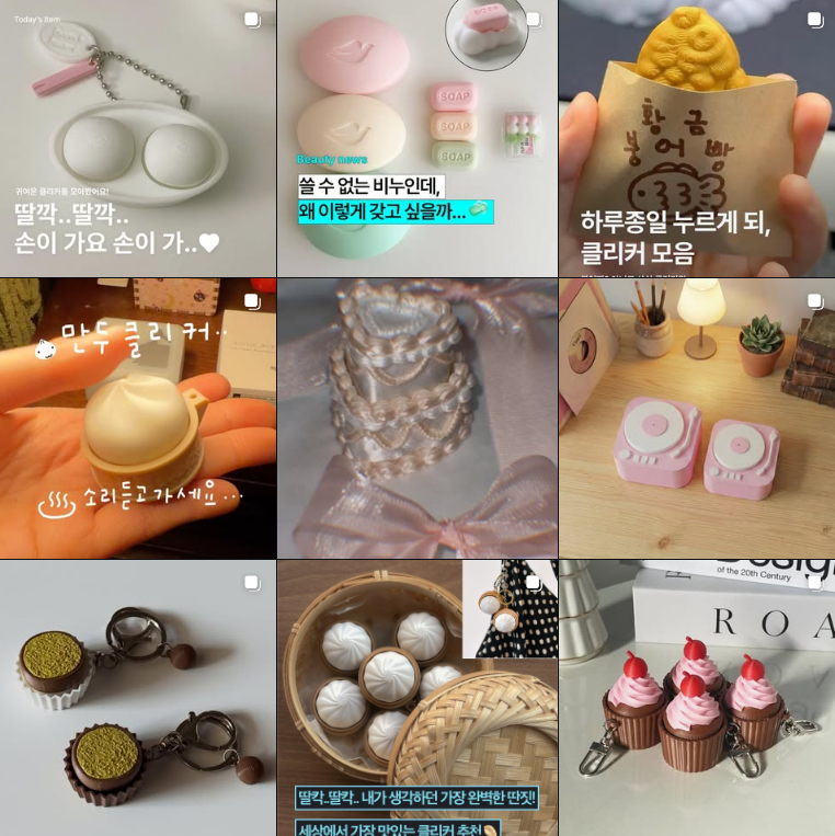손가락으로 버튼을 누르는 클리커와 양손으로 주무르며 노는 말랑이(스퀴시)가 국내외로 유행을 하고 있어요! 둘 다 손으로 누르고, 만지마 스트레스를 해소하는데도 좋다고 하는데요. 단순한 색이나 모양이 아닌 귀엽고 다양한 디자인이 나오며 더 큰 관심을 받고 있어요.