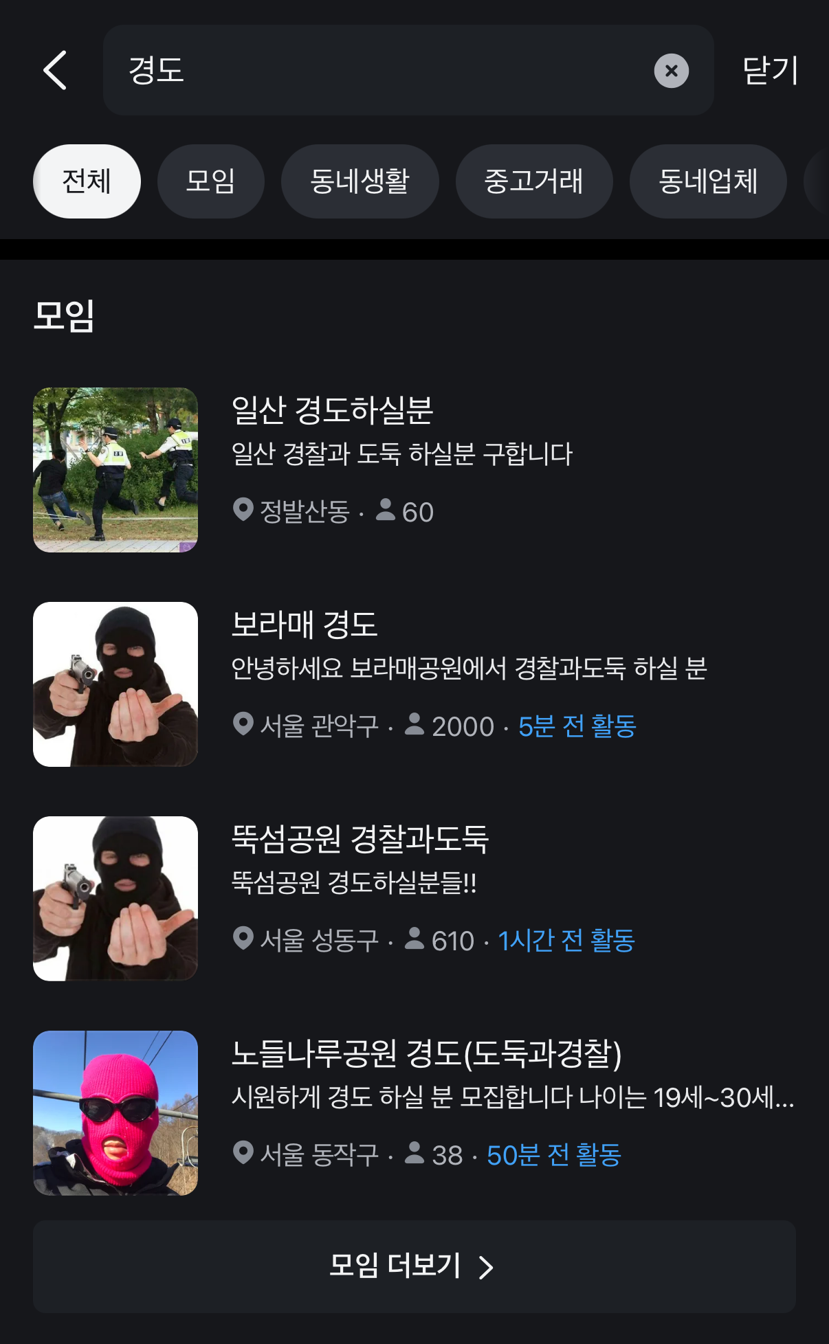 중고거래 플랫폼 '당근'에서 추억의 게임 '경도(경찰과 도둑)'할 사람을 모집하고 있어요!