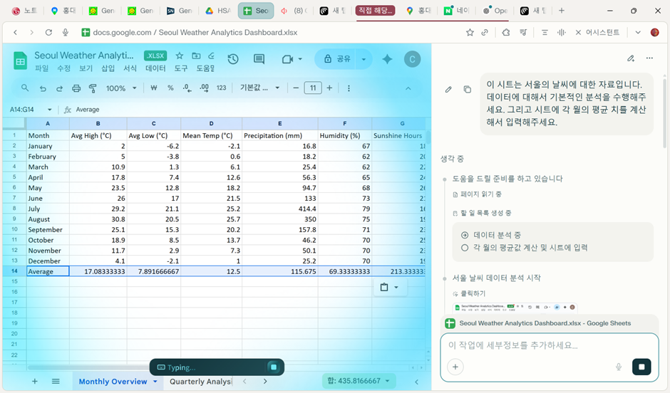 시트를 활용할 수 있다는 것도 대단합니다. 데이터를 분석하는 것을 넘어서 시트에 직접 작업까지 해줍니다. 제일 아래에 있는 Average는 제가 요청했더니 AI가 새로운 행을 추가해 준 것으로 함수도 제대로 잘 들어가 있습니다.
