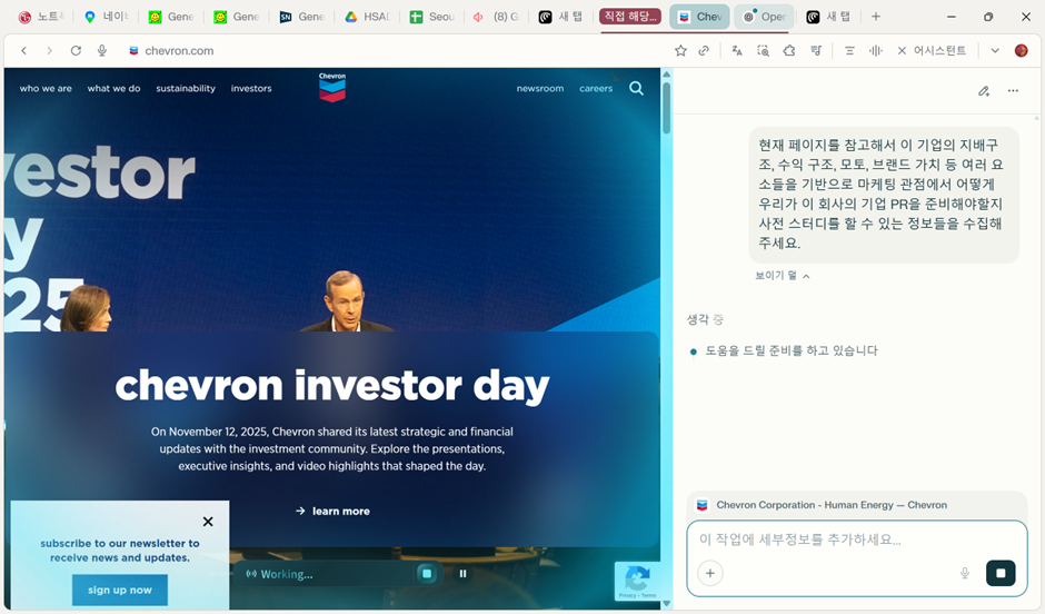 PT를 위한 사전 스터디 자료를 리서치하는 데에는 정말 적은 시간이 주어집니다. 그때도 똑같이 활용하면 됩니다. 해당 회사 홈페이지에 들어가서 역시 어시스턴트 버튼을 누르고 수집하기를 원하는 정보들을 요청합니다. 기존 같으면 왼쪽 위에 있는 ‘who we are’ 같은 버튼에 있는 하위 버튼들을 하나하나 눌러야 하고, 때로는 뉴스 기사나 유튜브 등을 찾아야 하는데, 이걸 이 창에서 한 번에 다 할 수 있게 된 거죠!