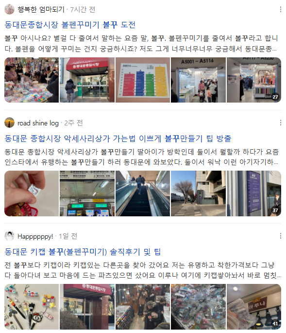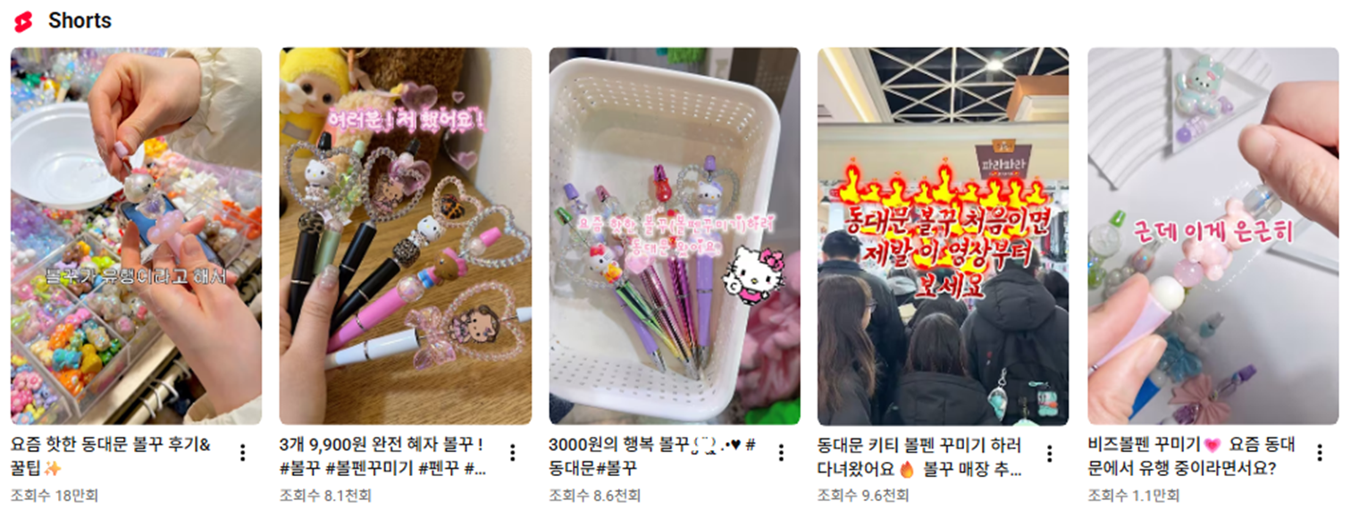 다양한 파츠와 비즈를 구매하여 직접 볼펜을 꾸미는 거예요. 저렴한 가격과 다양한 디자인을 한눈에 보기 위해 사람들은 동대문을 선택했고, 원하는 파츠나 비즈를 위해 다양한 매장을 다니며 매장 추천을 하는 경우도 있어요. 동대문뿐만 아니라 이러한 문구자재를 판매하는 시장 등도 함께 화제가 되고 있는데요.