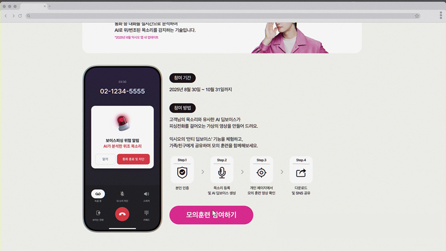 먼저 디지털 광고 영상을 통해 딥보이스를 활용한 보이스피싱 상황을 직관적으로 보여주며, AI 범죄가 더 이상 낯선 위험이 아니라는 점을 인식시키고 익시오의 ‘안티딥보이스’ 기능을 통해 예방할 수 있음을 알렸습니다.