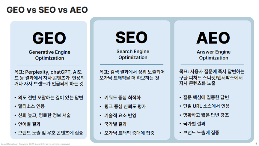 이처럼 생성형 AI 기반 서비스의 영향력이 커지면서, 이들이 내놓는 답변 안에서 우리 브랜드가 얼마나 자주, 얼마나 길게, 얼마나 긍정적으로 언급되는지가 점점 더 중요해지고 있습니다. 이런 맥락에서 떠오른 개념이 바로 GEO, 즉 생성형 엔진 최적화(Generative Engine Optimization, GEO)입니다. 유사한 개념으로 AEO(Answer Engine Optimization)가 함께 언급되기도 하지만, 실무적으로는 거의 같은 맥락에서 쓰이기 때문에 이 글에서는 GEO라는 용어로 통일해서 설명하겠습니다.