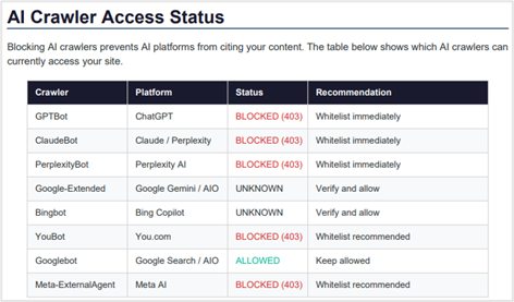 같은 요소를 한 번에 점검해 주기 때문에, 전문적인 GEO 진단을 매우 적은 비용으로 반복 수행할 수 있는 환경을 만들어 줍니다.