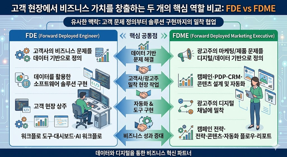 제가 제안하는 가설적 직무명입니다. 엔지니어링 세계의 FDE/FDSE처럼, 마케팅에서도 소수 정예 FDME 팀이 여러 광고주의 디지털 마케팅·CRM·콘텐츠·데이터 문제를 폭넓게 커버하는 형태를 상상해 본 것입니다.